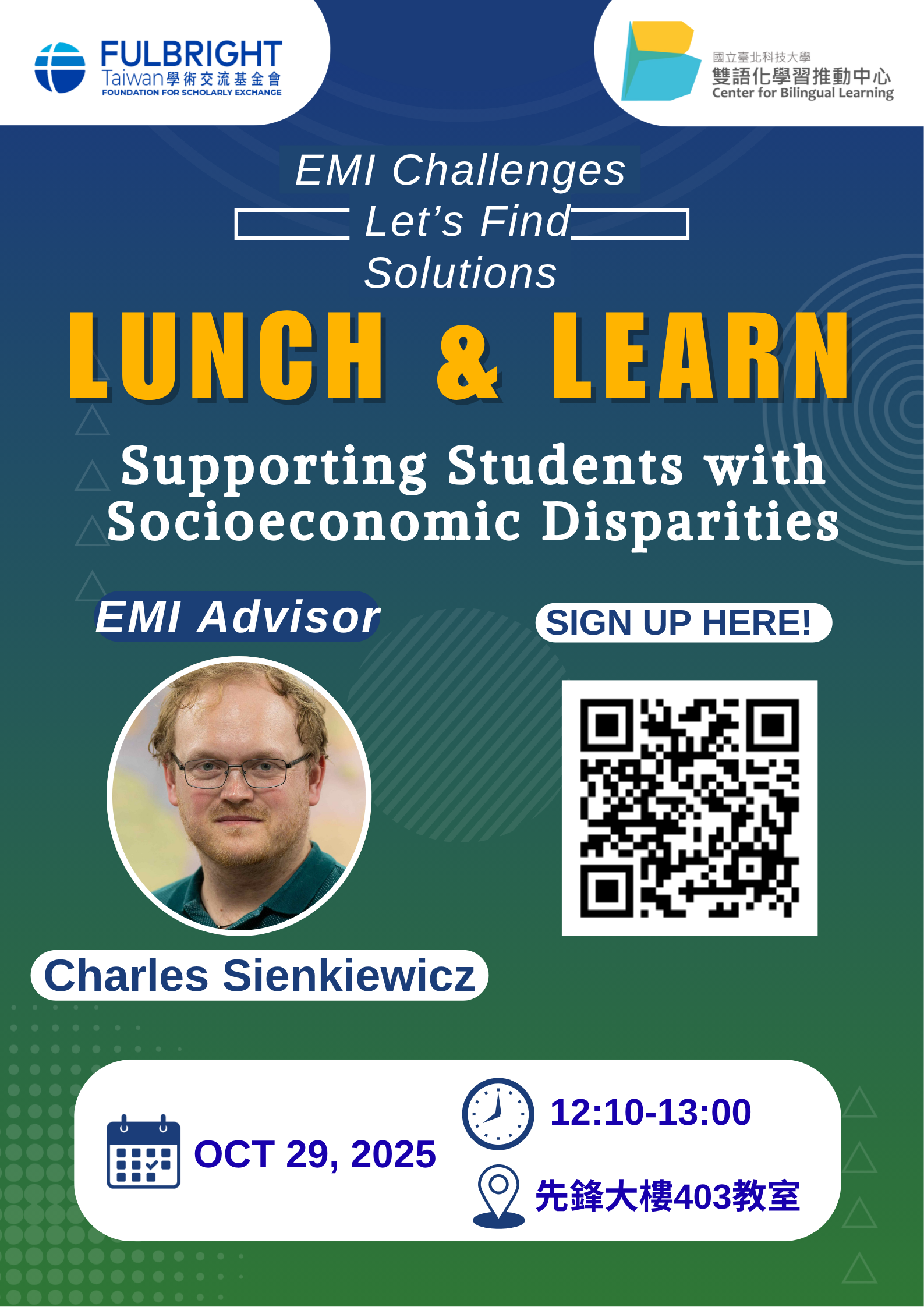 一、旨揭工作坊為國立臺北科技大學雙語中心與Fulbright Taiwan學術交流基金會協同規劃之活動,透過美籍專業教學顧問辦理午餐學習系列工作坊, 探討EMI課堂相關教學及學生引導技巧,提升學生學習成效。