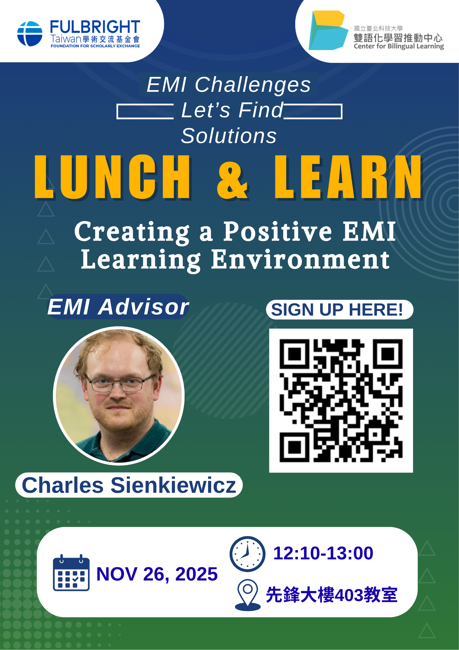 一、旨揭工作坊為國立臺北科技大學雙語中心與Fulbright Taiwan學術交流基金會協同規劃之活動,透過美籍專業教學顧問辦理午餐學習系列工作坊, 探討EMI課堂相關教學及學生引導技巧,提升學生學習成效。