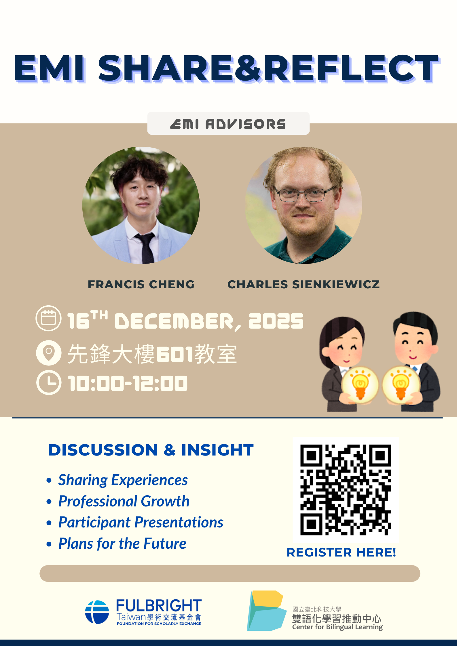 一、旨揭工作坊為國立臺北科技大學雙語中心與Fulbright Taiwan學術交流基金會協同規劃之活動,透過美籍專業教學顧問辦理EMI教學增能工作坊,協助教師提升全英語授課之專業知能,持續發展EMI課程之實務成效。