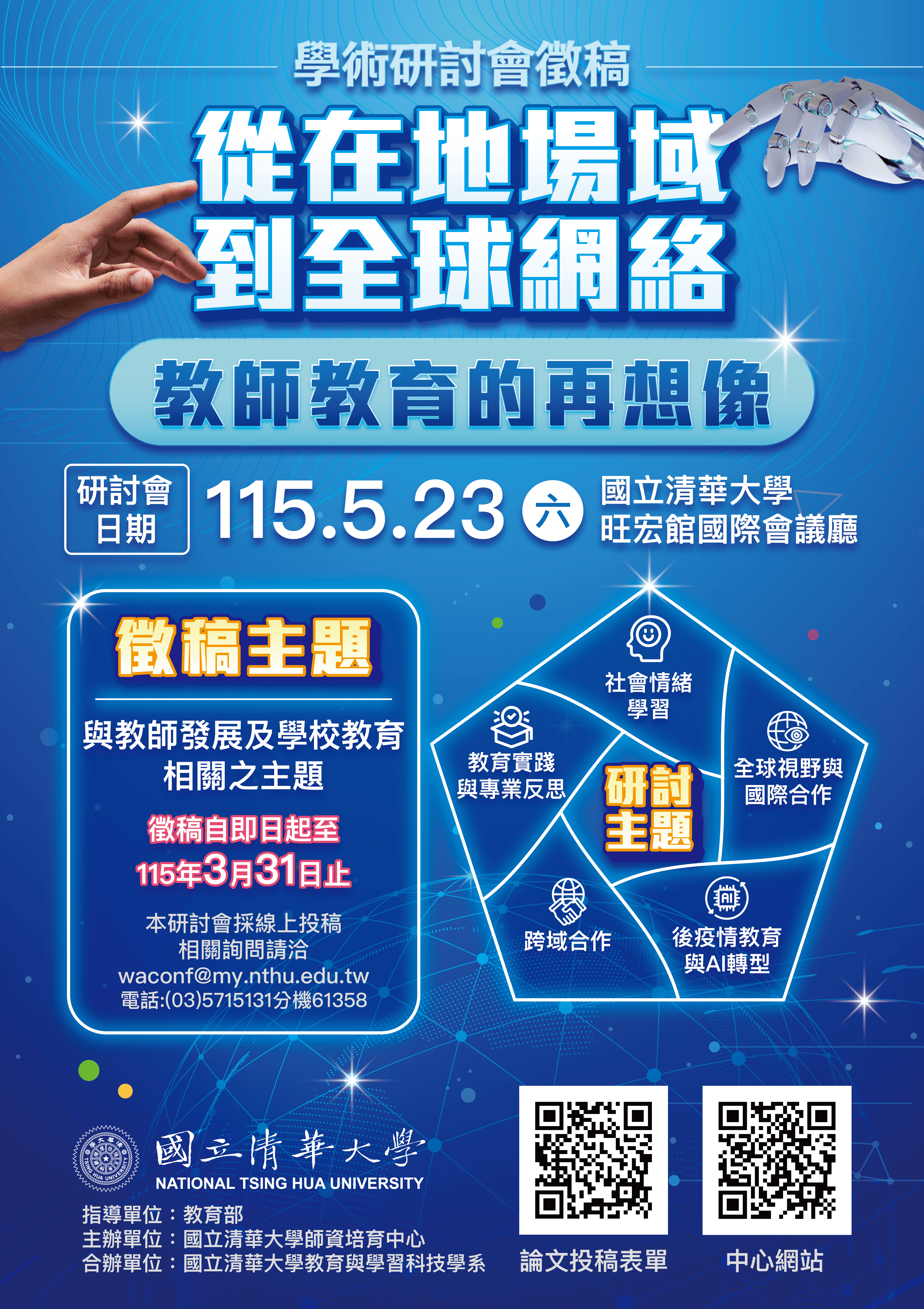 (三)研討議題包含但不限於:教育實踐與教師專業反思、社會情緒學習(SEL)融入實踐、後疫情及人工智慧(AI)脈絡下的師資培育、跨域合作實踐,以及全球視野與國際合作等相關議題。