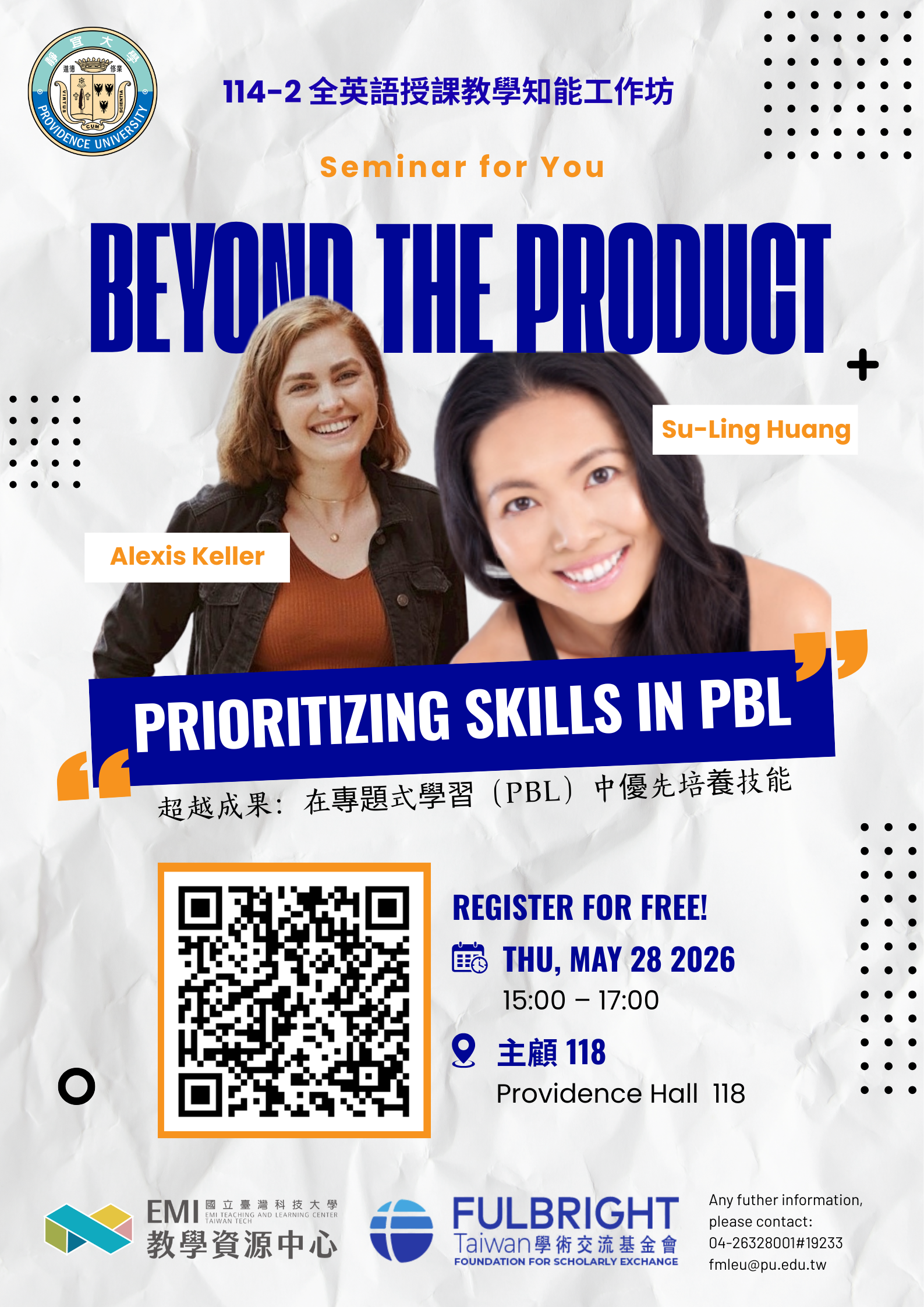 一、為協助各大專院校提升EMI課程之教學知能,靜宜大學外語教學中心和國立臺灣科技大學EMI教學資源中心合作舉辦EMI講座,秉持資源共享之理念,提升教師教授EMI課程之助益及成效。