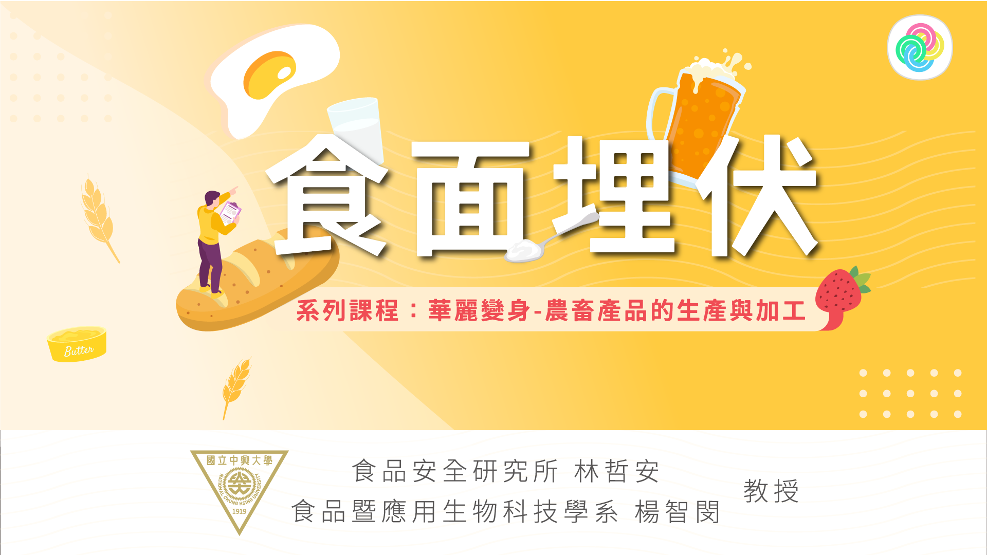 四、本課程為「大學聯盟深化數位學習推展與創新應用計畫」醫農藝工聯盟所規劃之「華麗變身:農畜產品的生產與加工」系列課程。